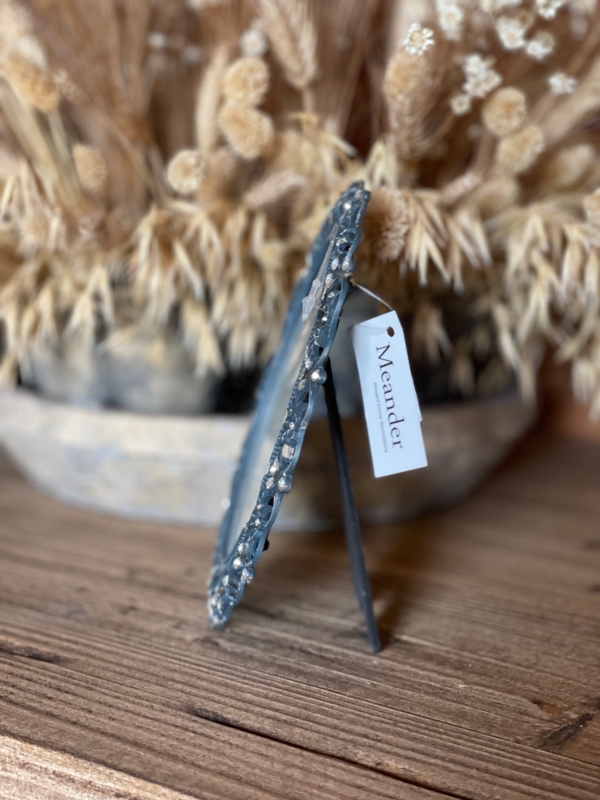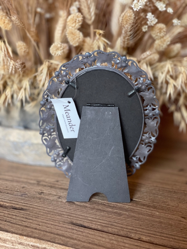 Mooi ijzeren fotolijstje met bloemen in de kleur grey. Hier en daar zijn er steentjes in verwerkt.