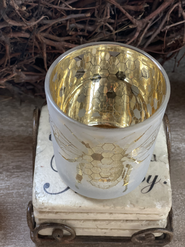 Mooie waxinehouder van melkglas. De binnenkant is goudkleurig met honingraat. Aan de buitenkant een mooie goude afbeelding van een bij.