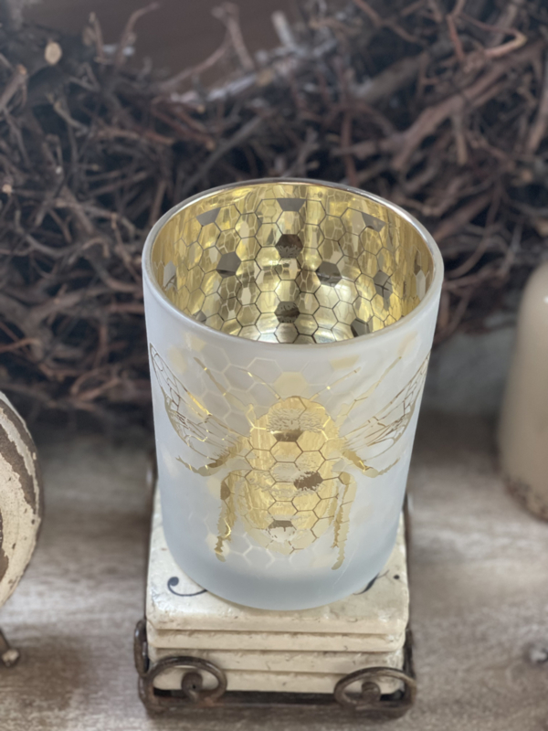 Mooie waxinehouder van melkglas. De binnenkant is goudkleurig met honingraat. Aan de buitenkant een mooie gouden afbeelding ven een bij.