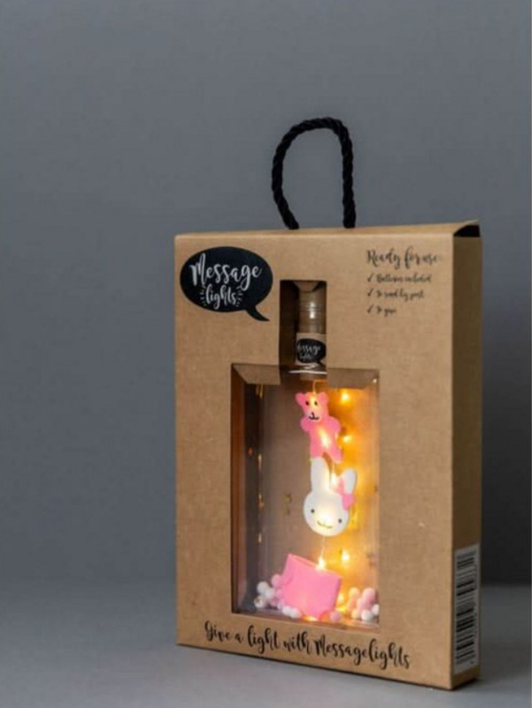 Stuur iemand licht toe! Flesje met lampjes en vilten figuurtjes in baby thema. Messagelights zijn PET-flesjes met een kurkje en een draadje, waar 6 LED-lampjes aan zitten. (incl 3 knoopcelbatterijen) Aan de draadjes zitten handgemaakte vilten figuurtjes, met verschillende thema's. Het licht van de lampjes schijnt sfeervol door de vilten figuurtjes. De flesjes zitten in een kraft verpakking. Op de achterkant zit een adressticker, waar een persoonlijke boodschap op kan worden geschreven. Kan per brievenbuspost worden verzonden! Erg leuk om te krijgen en te geven!